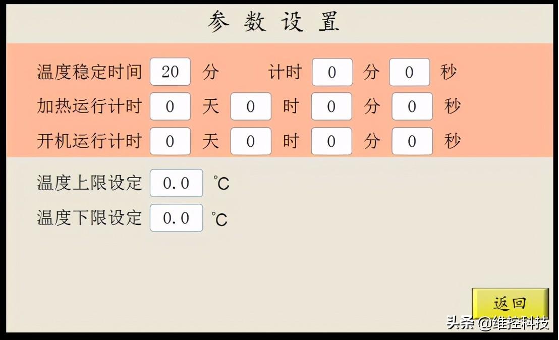 3、参数设置界面:可以显示机器当前运行时间和设置温度报警时间和范围。