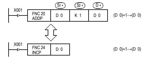 ADD[P],就是每次X001从OFF变为ON时,D0的内容上加一运算。 这个指令虽然与后述的INCP指令很类似,但是有下面一些内容上的不同。