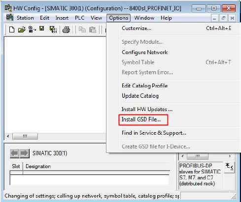 1)在硬件组态界面中,关闭所有已打开的项目,点击菜单栏“Options”下的“Install GSD File…”