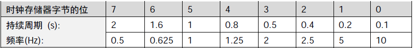 节中的每一位都可生成方波脉冲。时钟存储器字节提供了 8 种不同的频率,其范围从 0.5 Hz