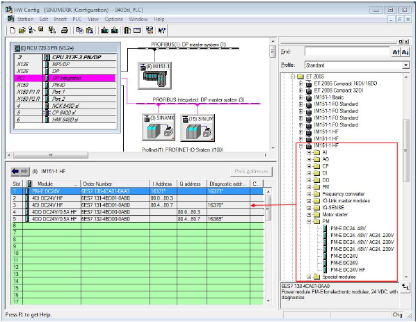 根据各模块的订货号,从硬件组态树型菜单栏中PROFIBUS DP > ET 200S>IM151-1 HF 目录,依