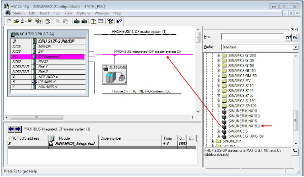 在硬件组态窗口,从菜单树 “PROFIBUS DP” > “SINAMICS” > “SINUMERIK NX…” 下查找 NX 模块,例如SINUMERIK NX 15.3。接着,用鼠标左键选中该模块,按住鼠标将它拖到组态设计窗口中的 “PROFIBUS Intergrated DP master system”网络上。