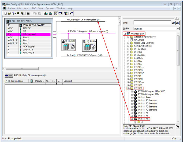 口模块IM151-1 HF,并拖拽插入到PROFIBUS (1) 网络下。