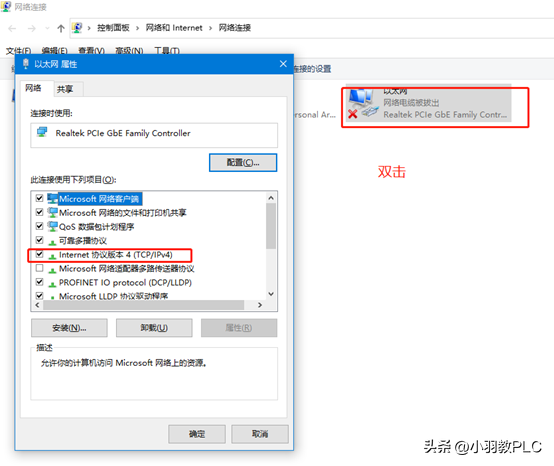 5、双击以太网,出现如图对话框,单击选择 Internet协议版本4,选择属性