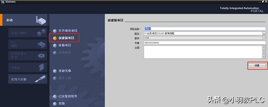 1、打开博图软件,单击创建新项目,填入项目信息,单击创建,在弹出的页面左下角选择项目视图。