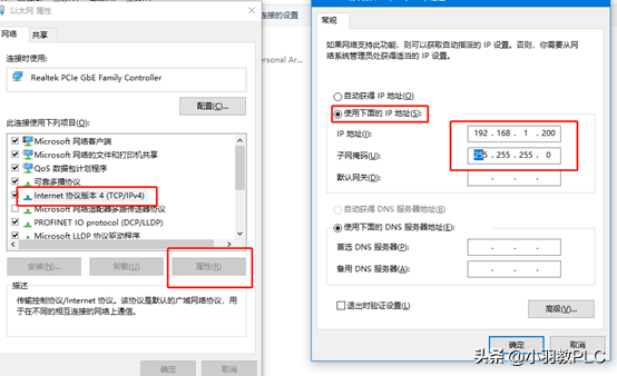 6、设置电脑的IP地址,IP地址要与CPU的在同一网段,且不同地址,例如我的PLC的IP地址是192.168.1.100,那么电脑的IP地址就不能是192.168.1.100,可以改为192.168.1.200。