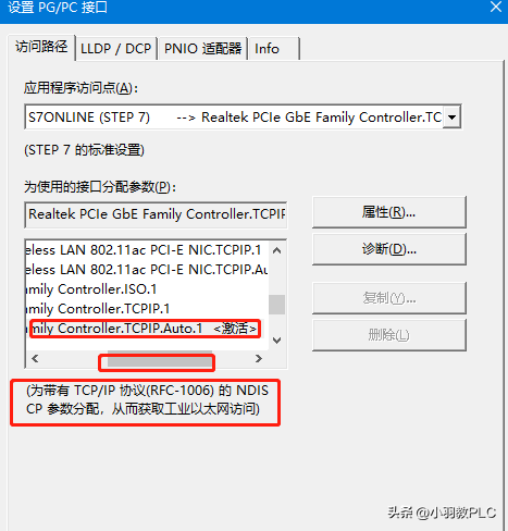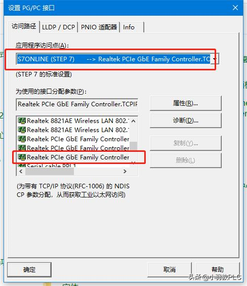 2、应用程序接口选择S7ONLINE,下方接口参数,选择您对应网卡的型号,例如图中有三个同样网卡型号,Realtek PCIe GbE Family Controller