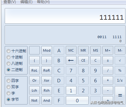 那么为什么要送63呢?因为按X0,则显示0,那么数码管就是Y0~Y5得电,大家可以通过计算机带的计算器来讲63换成二进制看看如下图: