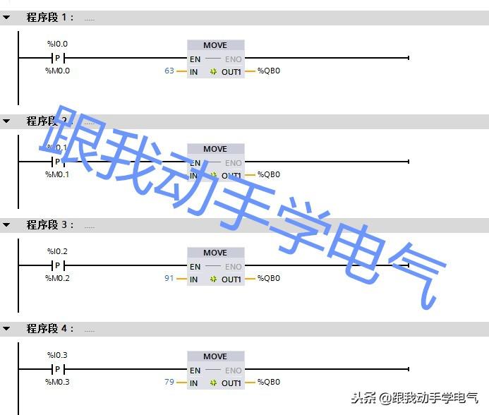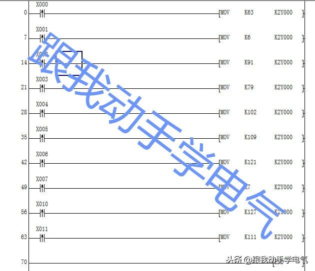 在本程序中用到MOV指令,下面看看MOV指令怎么用?在本例中第一行就是将十进制数63送到Y0~Y7的8位中(注:K代表10进制常数H代表16进制常数,K1Y0就是Y0~Y3,K2Y0就是Y0~Y7,在我以前的文章中有关于这部分的讲解,这里简单回顾下),