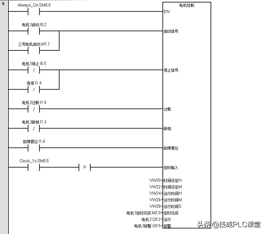 当停止或则急停触发时会使电机停止,当过载或缺相触发时,使电机停止,并输出报警。VW0、VW2是对电机运行的时间设定,VW4、VW6、VW8是电机的运行时间。