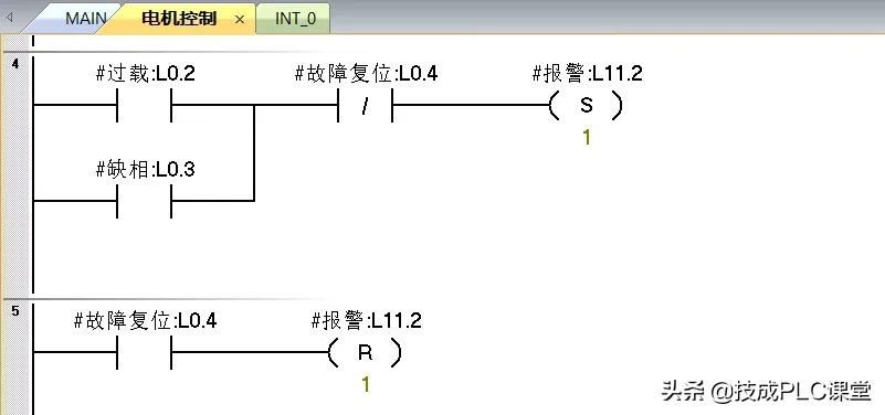 程序段4:当有过载L0.2或者缺相L0.3时会触发报警输出L11.2,复位的时候会暂时断开输出,如果故障没有解除,即使复位也没办法把报警消除。