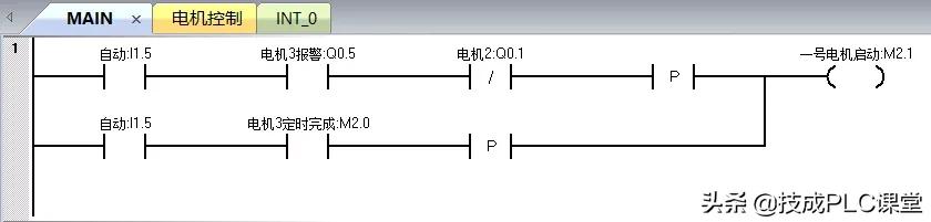 程序段2:启动I0.0或一号电机启动都可以对电机进行启动,对运行位输出。停止、急停、过载、缺相,由于外部用的是常闭开关,没有触发的情况下,对应的通道会为1,所以这里使用了常闭触点。
