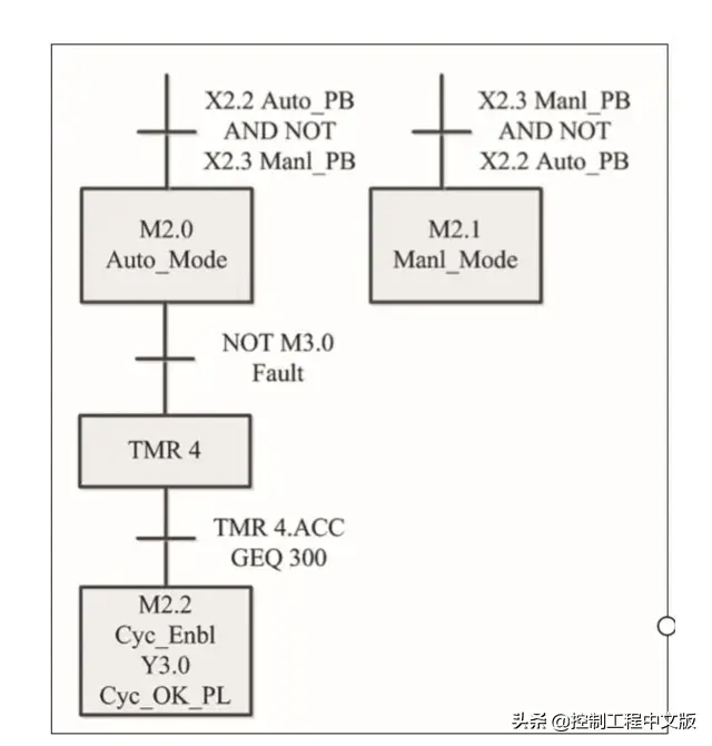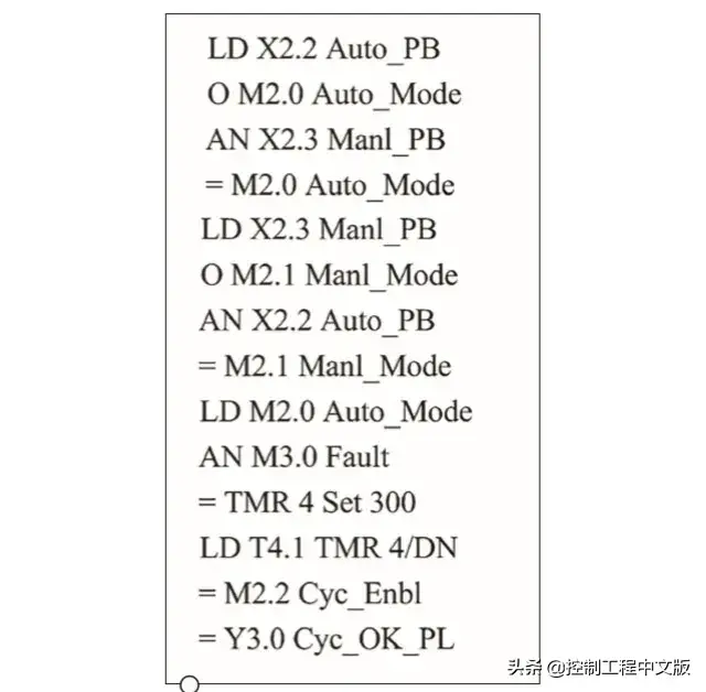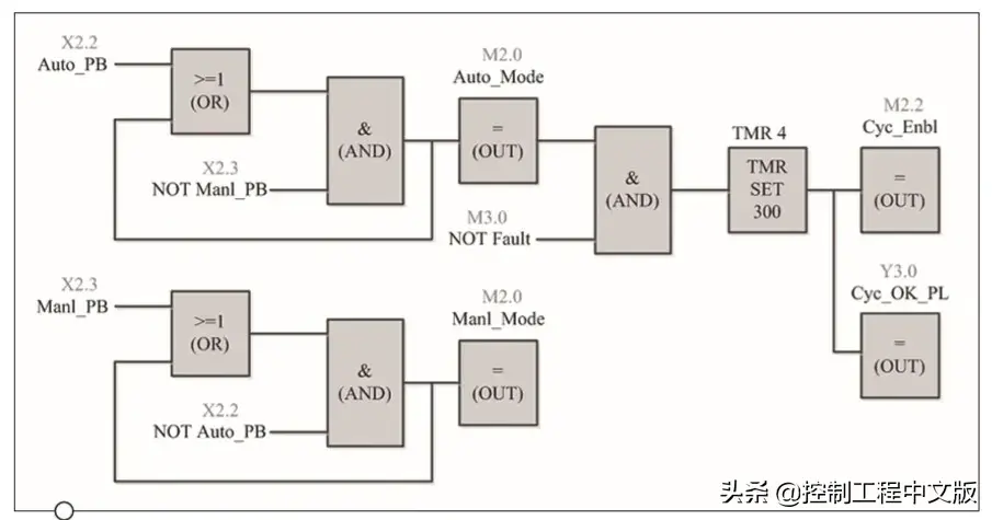 几年前,我突发奇想 :如果用所有5种语言,来编写一小段代码进行比较,将会非常有趣。逻辑建立自动和手动模式,然后在3秒钟后激活“循环”位。它是通用的,但是基于我使用的PLC平台(图1至图5)。语法和代码显示方式会因软件品牌和平台而异。