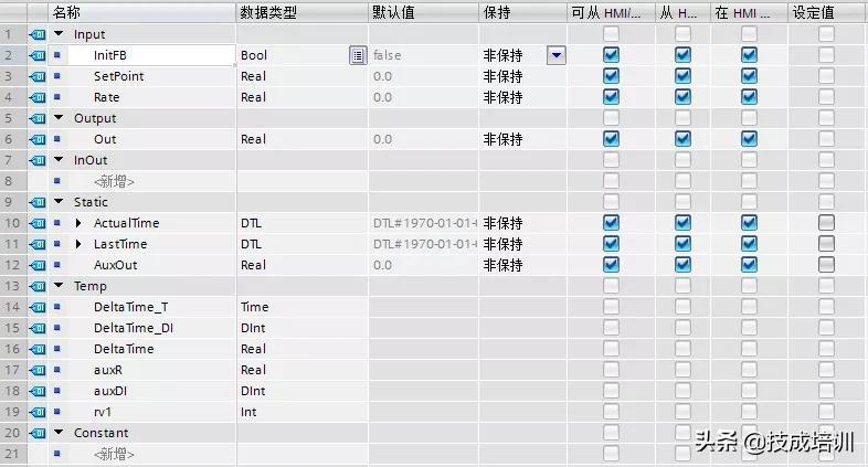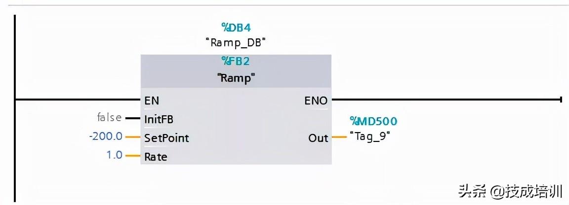 输出值按照指定斜率(单位/秒)跟随设定值,可以用来防止数值突变,这个功能可以在博途中添加扩展库函数(LGF)后直接调用Ramp函数。