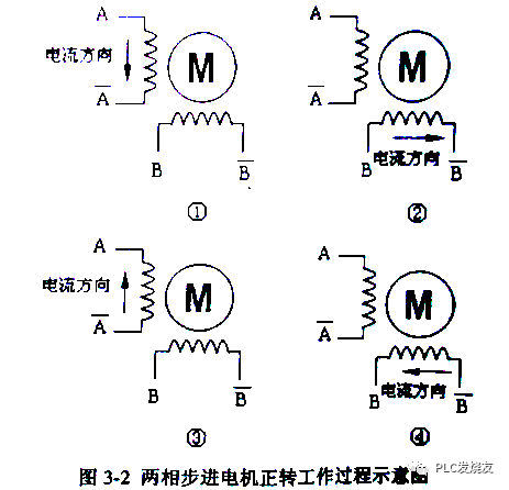 根据这个原理,如图3-2所示,两相步进电机的转动步骤,以正转为例:
