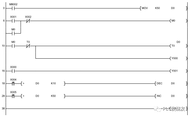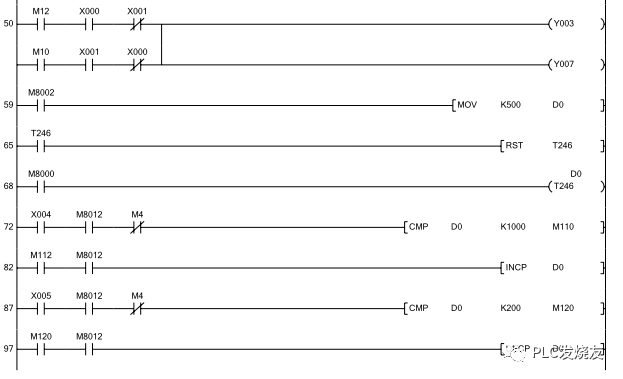 第73步中,当X4为ON,M8012为ON,M4为ON,且D0当前值<K1000,则D0即加1。第88步中,当X5为ON,M8012为ON,M4为ON,且D0>K200,由D0即减1。
