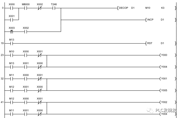 X0为ON时,输出正脉冲列,步进电机正转。当X0为ON时,T246以D0值为预置值开始计时,时间到,T246导通,执行DECO指令,根据D1数值(首次为0),指定M10输出,Y0、Y4为ON,步进电机A相通电,且实现电流方向A+→A-;D1加1,然后,T246马上自行复位,重新计时,时间到,T246又导通,再执行DECO指令,根据D1数值(此次为1),指定M11输出,Y1、Y5为ON,步进电机B相通电,且实现电流方向B+→B-;D1加1,T246马上又自行复位,重新计数,时间到,T246又导通,再执行DECO指令,根据D1数值(此次为2),指定M12输出,Y2、Y6为ON,步进电机A相通电,且实现电流方向A-→A+;D1加1,T246马上又自行复位,重新计时,时间到,T246又导通,再执行DECO命令,根据D1数值(此次为3),指定M13输出,Y3、Y7为ON,步进电机B相通电,且实现电流方向B-→B+;当M13为ON,D1复位,重新开始新一轮正脉冲系列的产生。