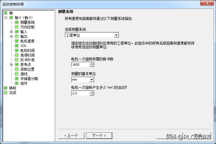 第四步: (测量系统单位—工程单位—电机一次旋转需要的脉冲数1600—测量的基本单位—MM—电机一次旋转产生多少距离的运动—2.0)