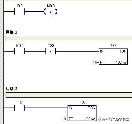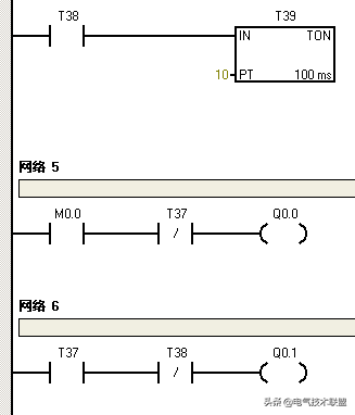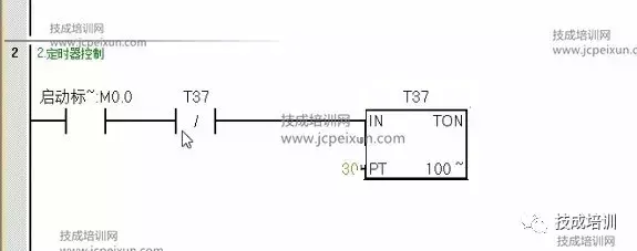 定时器PT值为3秒(数值计作30),使用TNO接通延时定时器,当当前值=设定值,状态输出为1时,即定时器状态位T37=1时,就去复位定时器,再从0开始,这个就是自复位,就是自己复位自己,到了3秒就从0开始。
