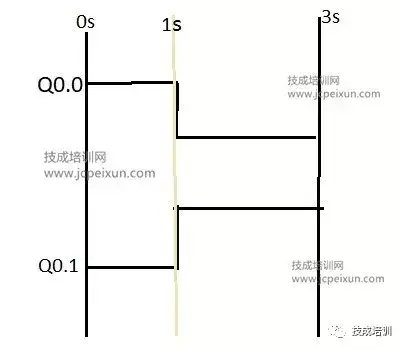 使用定时器Q0.0和Q0.1,当按下启动按钮时Q0.0亮,1秒后Q0.0灭,同时Q0.1亮,再过两秒后Q0.1灭。以此循环,直到按下停止按钮,Q0.0和Q0.1全灭