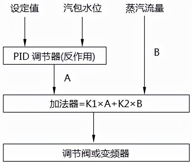 副调(外给定调节器)使用了一个反馈信号(给水流量)和一个前馈信号(蒸汽流量),以消除扰动和虚假水位。