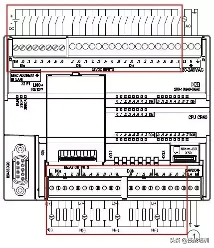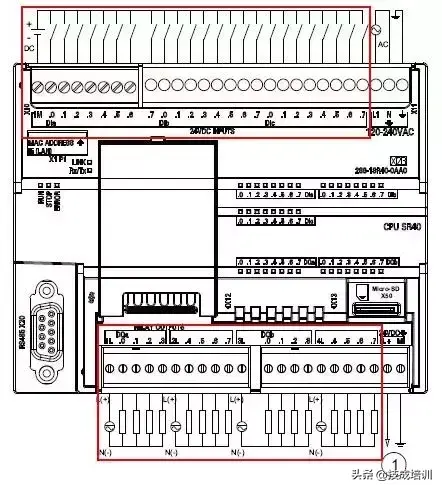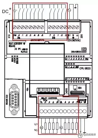 I/O扩展模块缺少24V直流供电电源时,所有通道指示灯也以红色闪烁。建议核对模块接线图,尤其是模块供电端含两排端子的,确定供电接线是否正确,以EM DR32为例,正确的接线方式如下图所示。