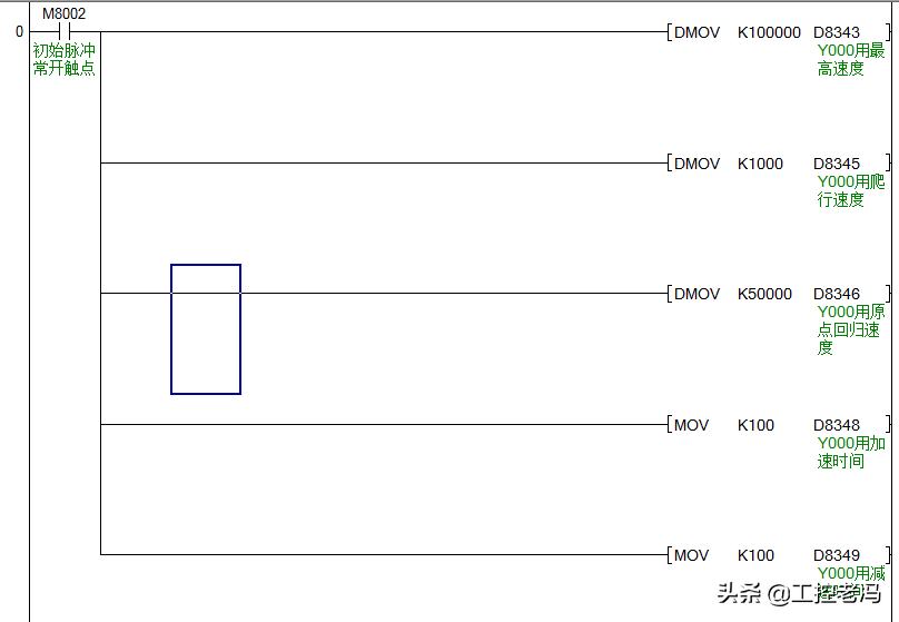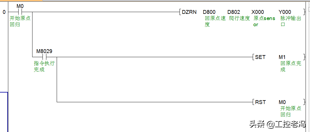 当按下M0的时候,Y0控制的伺服开始回原点,方向默认为当前值寄存器减少的方向,也就是图中的左方向。其中X0为原点sensor,工作台先以D800的速度往左移动,当X0感应到工作台时,再以D802继续往左移动,知道X0感应不到工作台时,工作台马上停止。此时当前值寄存器会自动清理,回原点指令执行完成。