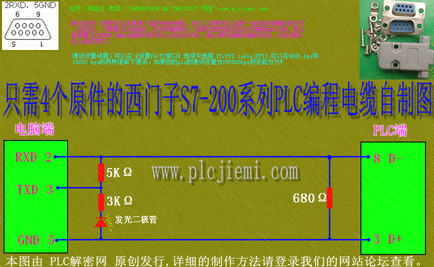 S7-200的使用起来,好爽,图中的发光二极管在通讯是会闪烁,这可是正版PPI电缆所没有的功能啊!只要4个原件,3k 、5k、680欧姆电阻各一个,发光二极管一只,误差不要超过10%,都是经过实际测量得出的数值,误差大了电流会不一样。OK了。。。。通讯原理232转485,去掉集成电路,超级简化,最少的原件,减到极限不能再减,但是功能不会减。下面跟我一起做:到电脑城等相关网点购买以下com口插头,公母各一个。根据地理区域不同这两个插头你可能要花费1元-2元人民币,淘宝售价0.16元/个,严重缺钱的可以到废旧电器上面找。