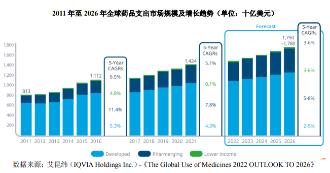 随着全球经济的发展、人口总量的增长、各国社会老龄化加剧、大众保健意识的提高以及各国医疗保障体制的日益完善,药品需求呈上升趋势,全球医药市场规模持续增长。全球药品市场竞争格局中,发达国家占据主要市场份额,但以中国为代表的新兴市场增长速度较快,发展潜力可观。根据艾昆纬统计数据,2021年全球医药市场规模达14,240亿美元,预计2022年至2026年全球药品支出将以3%-6%的复合增长率保持增长,2026年将接近1.8 万亿美元水平。