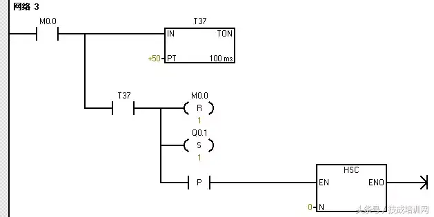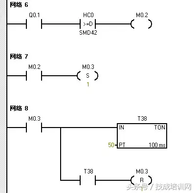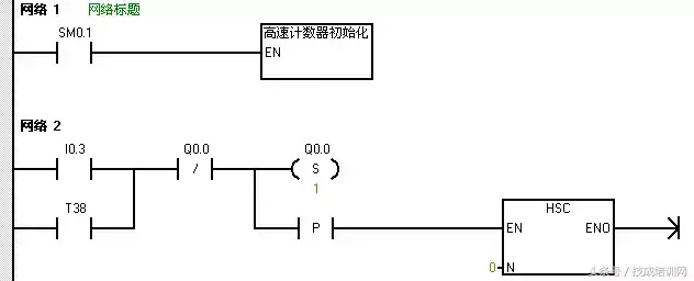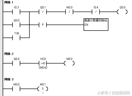 因为控制要求是按下启动按钮I0.3,Q0.0输出,电机正转。 首先就做个起保停程序,I0.3启动串联I0.4停止,来驱动输出Q0.0并做Q0.0的自锁,同时做一个用I0.3的上升沿来调用高速计数器初始化子程序,注意这里的起保停是有做正反转的互锁的。然后再用Q0.0常开触点串联一个HC0大于等于SMD42的比较指令来输出M0.0,并把M0.0的常闭触点串联在起保停程序中,作为高速计数器计到50个脉冲后电机停止。