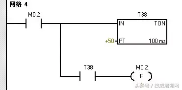 电机停止过5s后又开始电机的正转, 那么我们就用M0.2来驱动来驱动定时器T38延时5秒,并用T38常开触点来驱动复位M0.2,这里也是为了让定时器定时时间到时复位定时器。同时我们用T38常开触点并联在电机正转的控制程序上,这样可以实现循环。