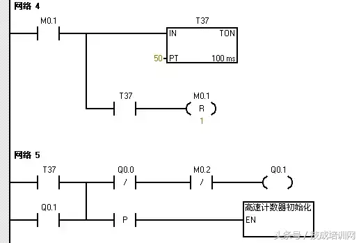 电机停止过5秒后Q0.1输出,电机反转,那么我们就用M0.0来置位M0.1,再用M0.1常开触点来驱动来驱动定时器T37延时5秒,并用T37常开触点来驱动复位M0.1,这里是为了让定时器定时时间到时复位定时器。然后再用T37常开触点来驱动输出Q0.1并做Q0.1的自锁,同时也用T37的上升沿来调用高速计数器初始子程序。然后再用Q0.1常开触点串联一个HC0大于等于SMD42的比较指令来输出M0.2,并把M0.2的常闭触点串联在起保停程序中,作为高速计数器计到50个脉冲后电机停止。