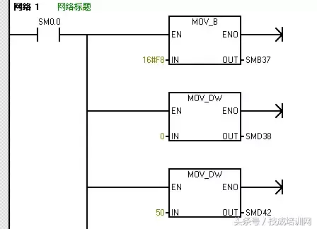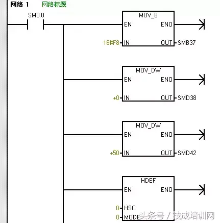 以上的程序中,首先做一个高速计数器初始化的子程序, 首先是定义控制字节,送16#F8到SMB37,定义为加计数更新当前值,这里写入初始值为0和预设值为50,定义的是高速计数器HSC0和HSC模式1,然后激活高速计数器。