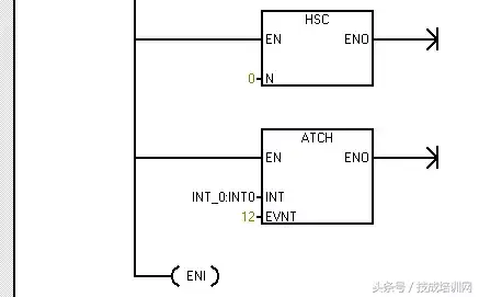 以上的程序中,首先做一个高速计数器初始化的子程序 ,首先是定义控制字节,送16#F8到SMB37,定义为加计数更新当前值,这里写入初始值为0和预设值为50,定义的是高速计数器HSC0和HSC模式1,然后激活高速计数器,还做了高速计数器中断,建立中断程序0和中断事件12的中断连接,并全局允许中断。