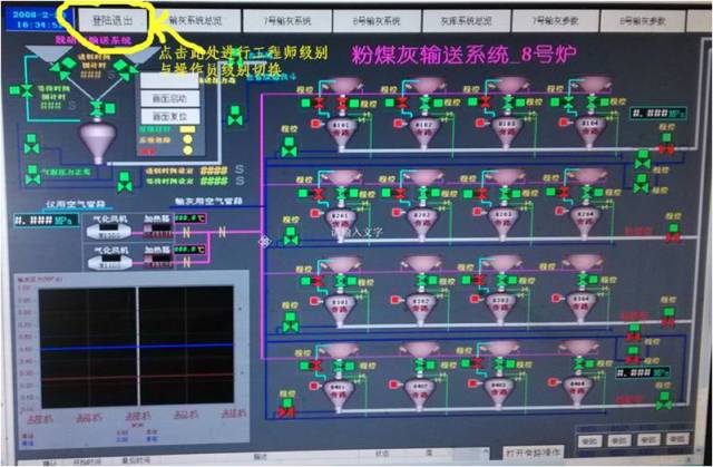 以35万输灰系统为例,下图为上位机IFIX运行画面,需要在工程师级别才能退出画面