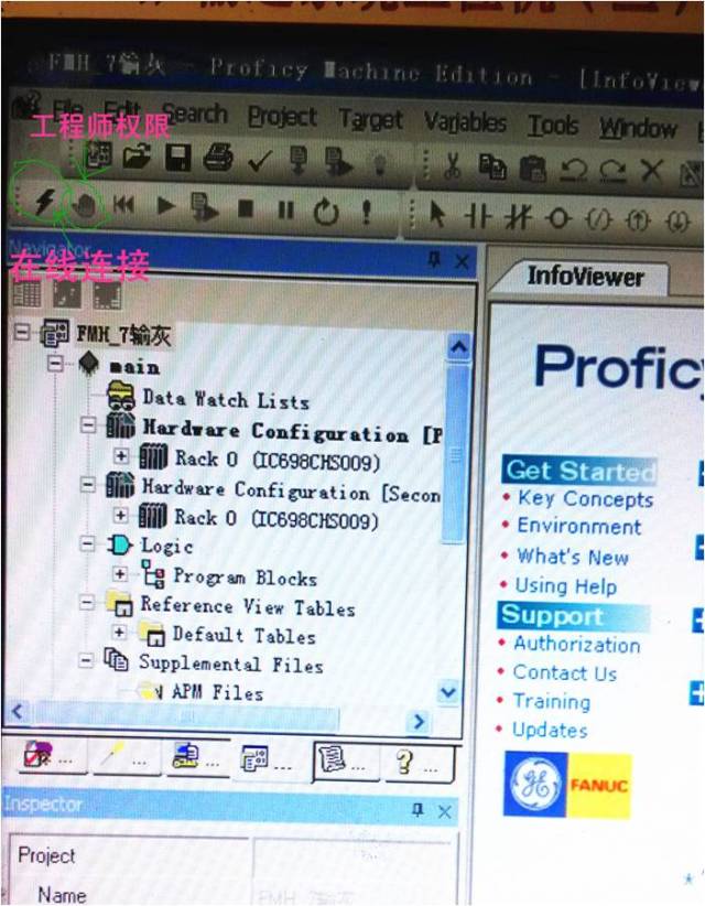 登录到工程师级别后就可以同时按下Ctrl+W,将运行画面退出到编辑画面。之后将编辑窗口最小化返回到电脑桌面。如图所示,Proficy Machine Edition为GE PLC的编程软件。下方图标为上位机IFIX启动快捷方式。