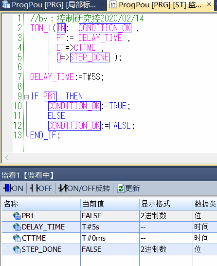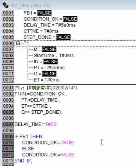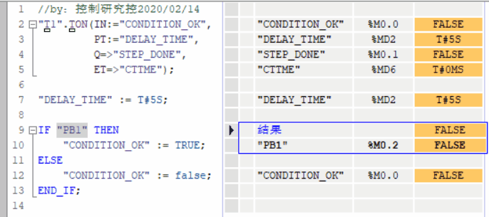 同样这个程序就是PB1值为1时,就让CONDITION_OK为真,这样定时器的IN管脚就接通了,定时器就开始工作!时间运行5S后,定时器的Q点也就是STEP_DONE就输出为真了!