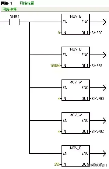 由于我们设定SM87.3 = 0确定使用报文长度不固定方式,在9600bps通讯速率下1个字符(10个位)的接收需要1.04ms,3.5个字符的时间需要3.64ms,因此将SMW92设定成4表示当字符与字符之间的空闲时间超过4ms时停止接收信息(注:SMW92不支持小数),同时空闲4ms后(SMW90 = 4)接收到的第一个字符是新信息的开始。