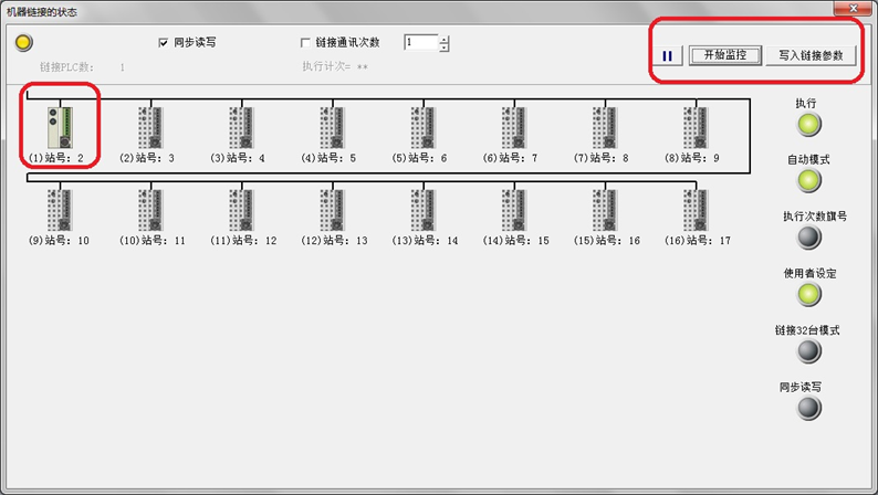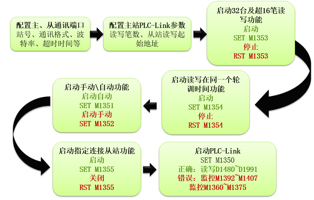 当 M1355=ON时,M1360~M1375(M1440~M1455)为指定要联机的标志,因此不管实际有接几台,PLC LINK功能都会按指定标志一直轮训发送读写命令。