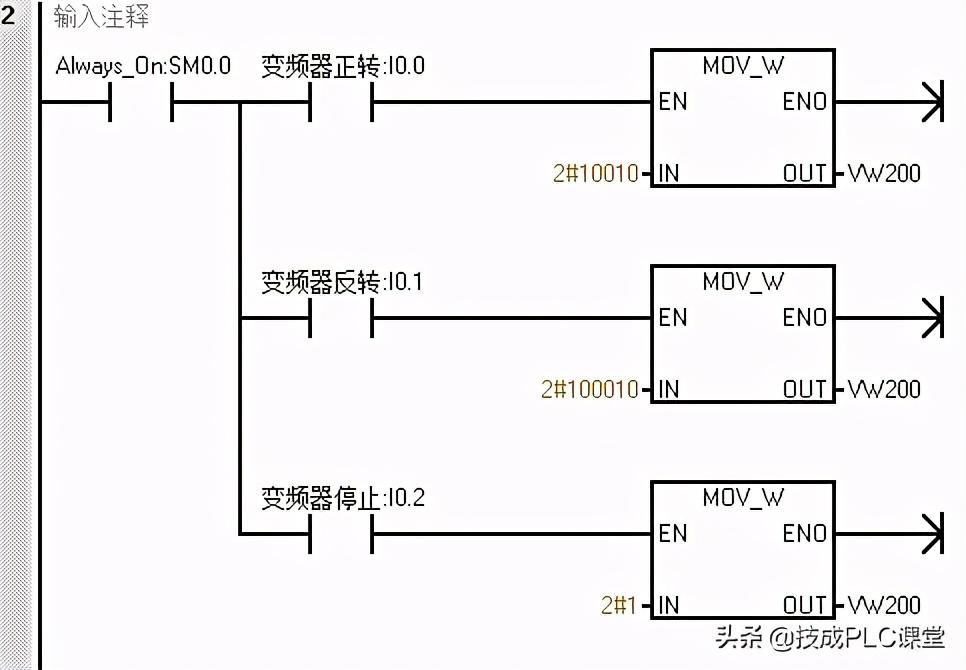 第二步:(按下I0.0命令值写入VW200变频器电机正转、按下I0.1命令值写入VW200变频器电机反转、按下I0.2命令值写入VW200变频器电机停止)