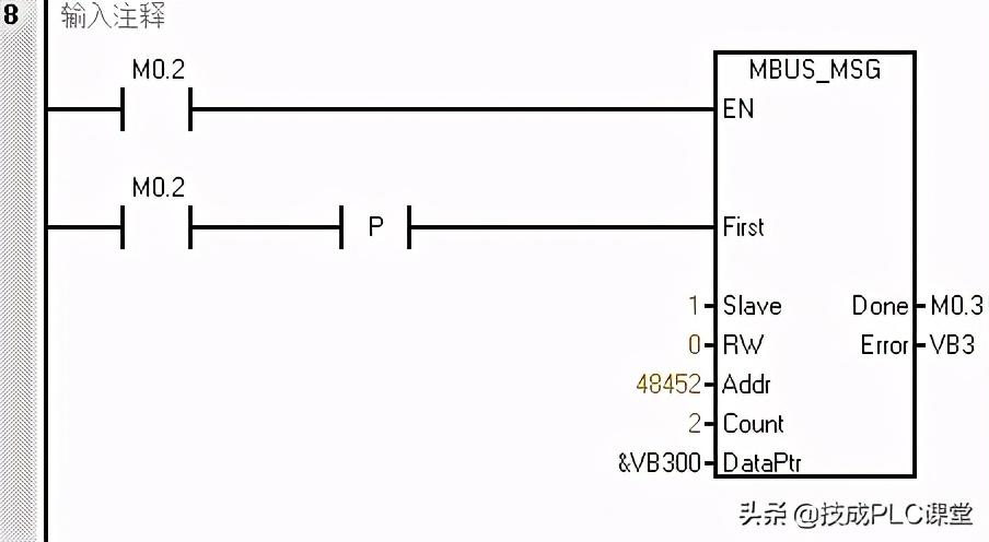 第八步:(M0.2接通读取变频器频率指令,读取变频器频率值存放在VW300当中,读取完成后M0.3接通)