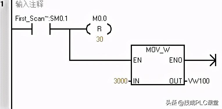 第一步:(上电初始化将完成标志位M点全部复位,同时将运行频率30HZ传送给VW100)