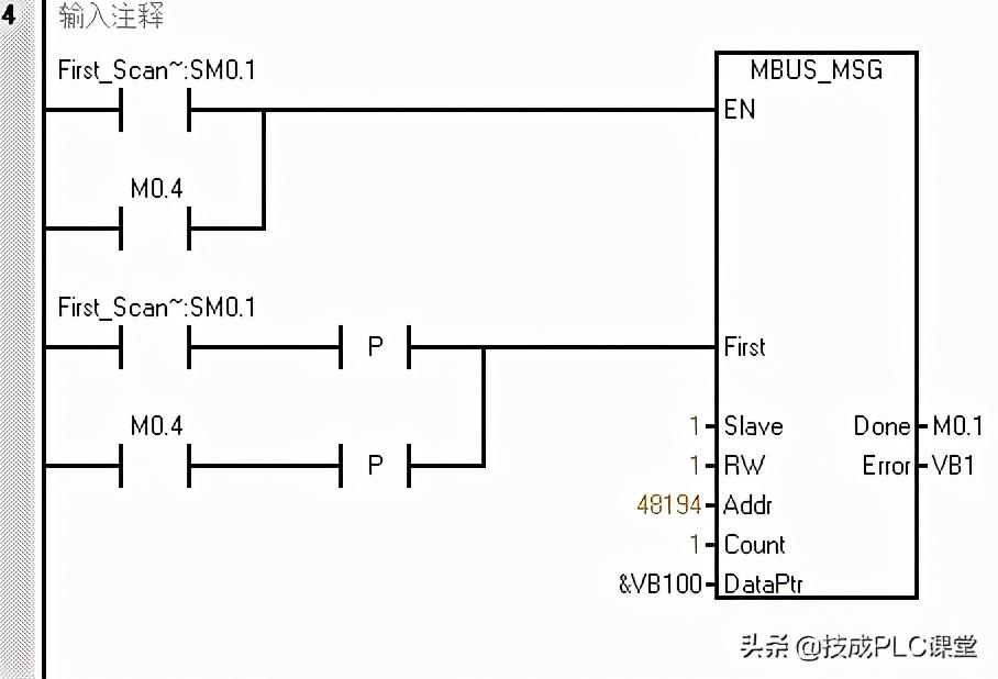 第四步:(SM0.1首次接通写入变频器频率指令,M0.4用轮询方式循环写入频率,VW100的频率值写入变频器当中,写入完成后M0.1接通)