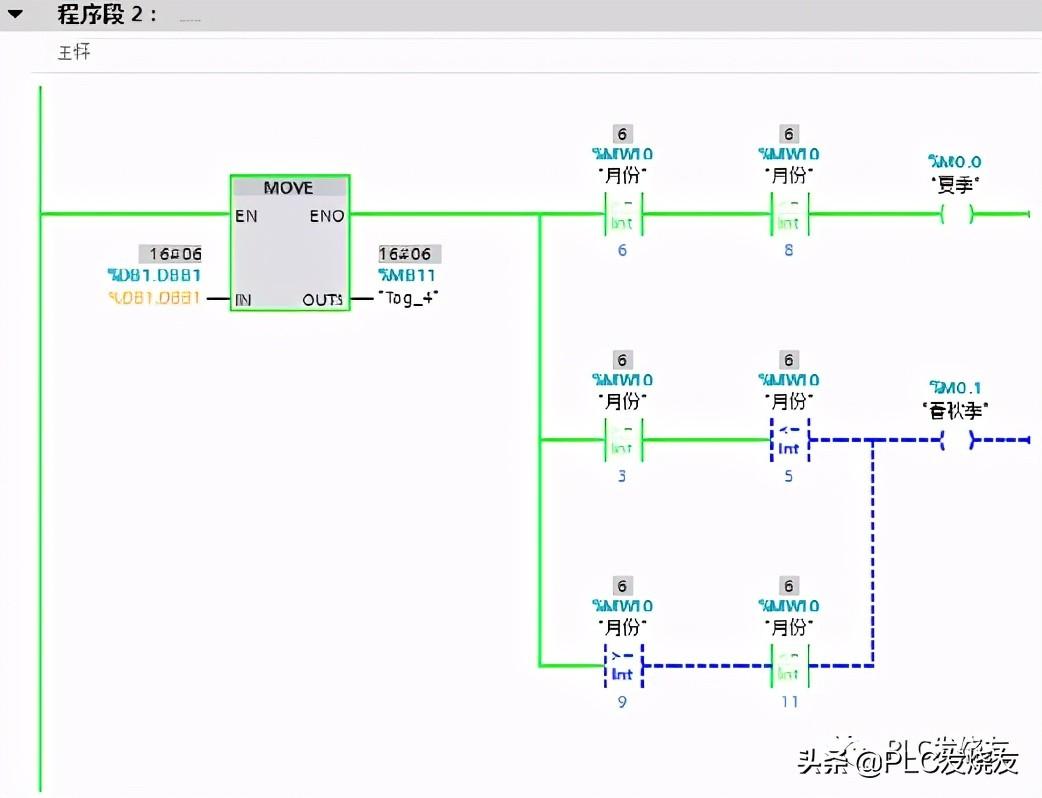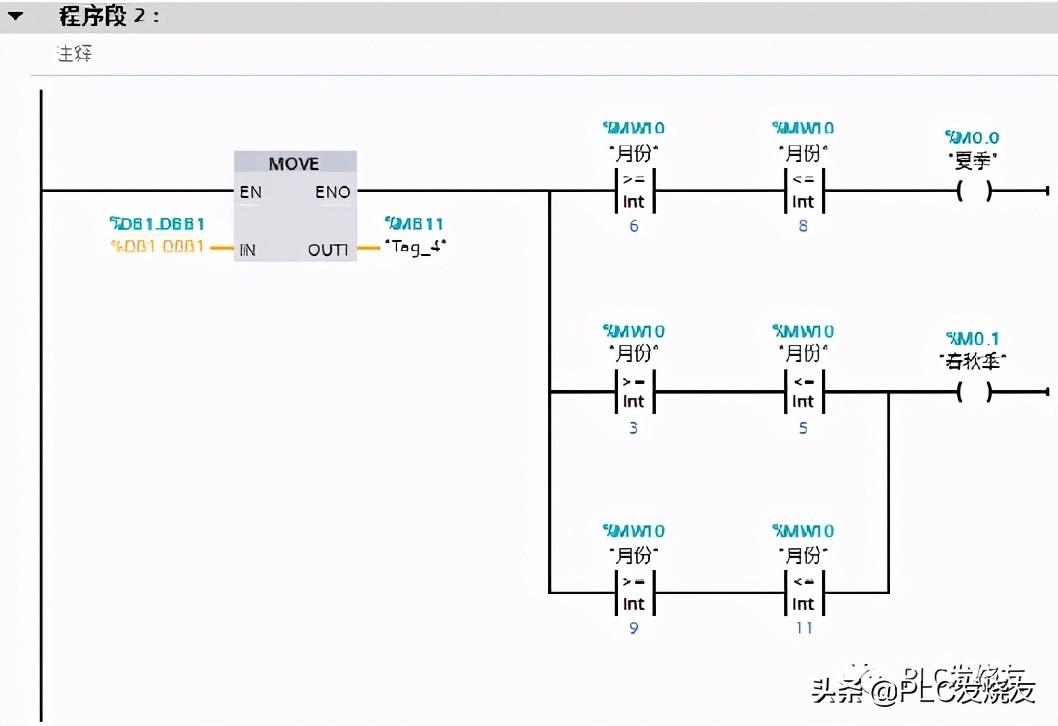 第二步: (在程序段2中,传送月份MW10的低8位(MB11)中,如果是6~8月(夏季),则M0.0线圈通电,如果是3~5月或9~11月(春秋季),则M0.1线圈通电。)