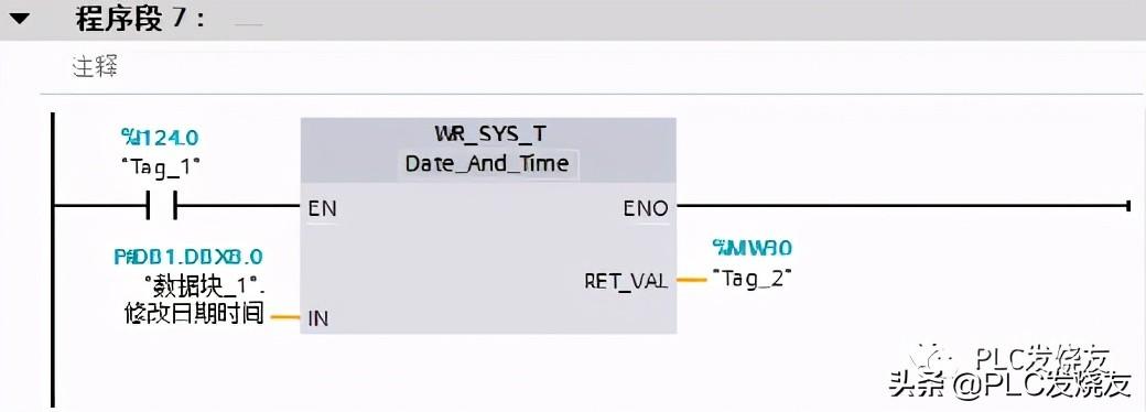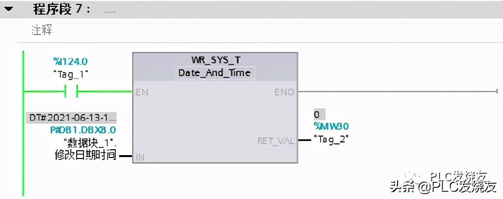 第七步: (在程序段7中,调试时不可能长时间等待,可以通过变量监控修改系统日期时间,然后接通I124.0将日期时间写入CPU中。)