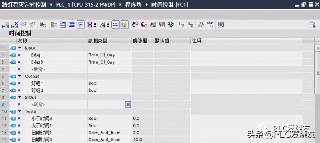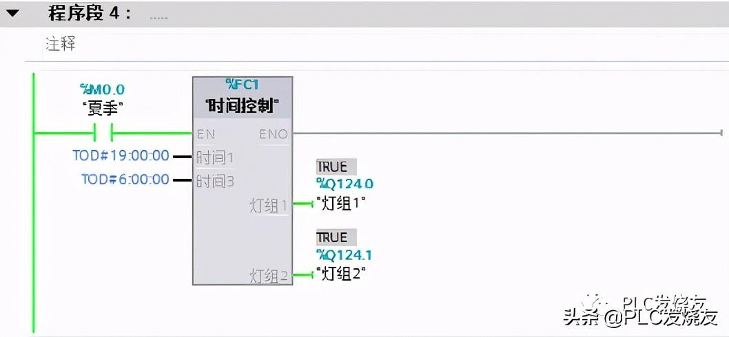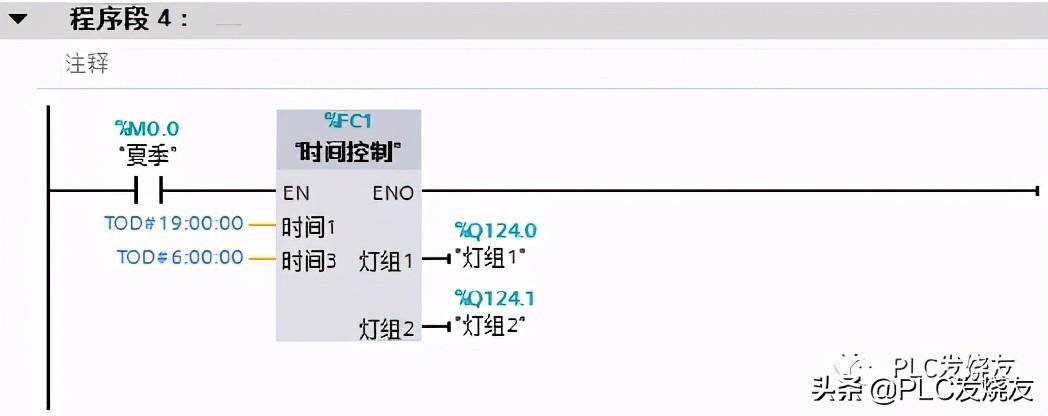第四步: (在程序段4中,如果是夏季,按设定的时间调用FC1,控制灯组1和灯组2。)