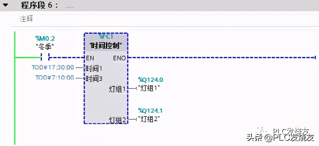 第六步: (在程序段6中,如果是冬季,按设定的时间调用FC1,控制灯组1和灯组2。)