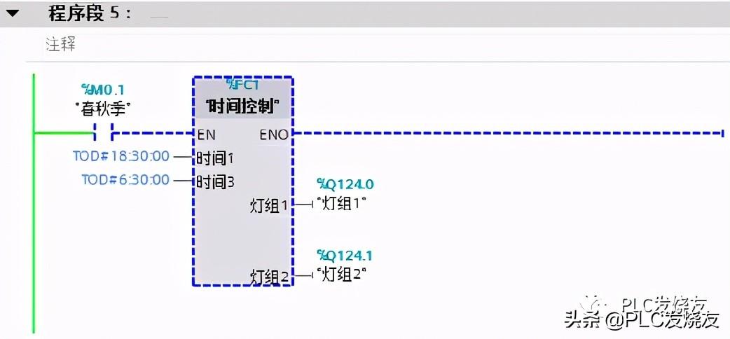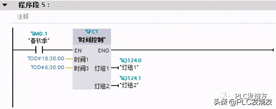 第五步: (在程序段5中,如果是春秋季,按设定的时间调用FC1,控制灯组1和灯组2。)