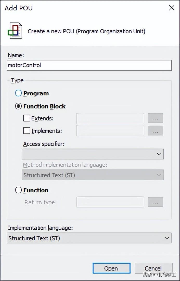 在弹出的“添加POU”对话框中,选择功能块(Function Block),命名为motorControl,编程语言选择ST语言,如下图所示: