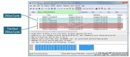一个PN控制下带3个最小报文帧(40个字节的C_SDU)的PN设备,PN 控制器的发送循环为250 ,通信建立后在PN接口上抓报分析PN的通信可以分析出PN数据帧对时间调度的情况,如下图8所示。